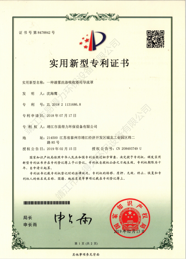 專利證書本公司坐落于開放開發(fā)超前城市江蘇靖江,我們精良優(yōu)秀設計團隊始終遵循著創(chuàng)新超越的理念,贏得了中外合資企業(yè)的信賴。易得力環(huán)保設備有限公司與上海環(huán)科院等科研單位保持合作關系,不斷加大自身的科研力量,集中了一批國內環(huán)境科技研究和應用方面的高素質人才,取得多項實用新型專利證書。…… 查看更多 >>